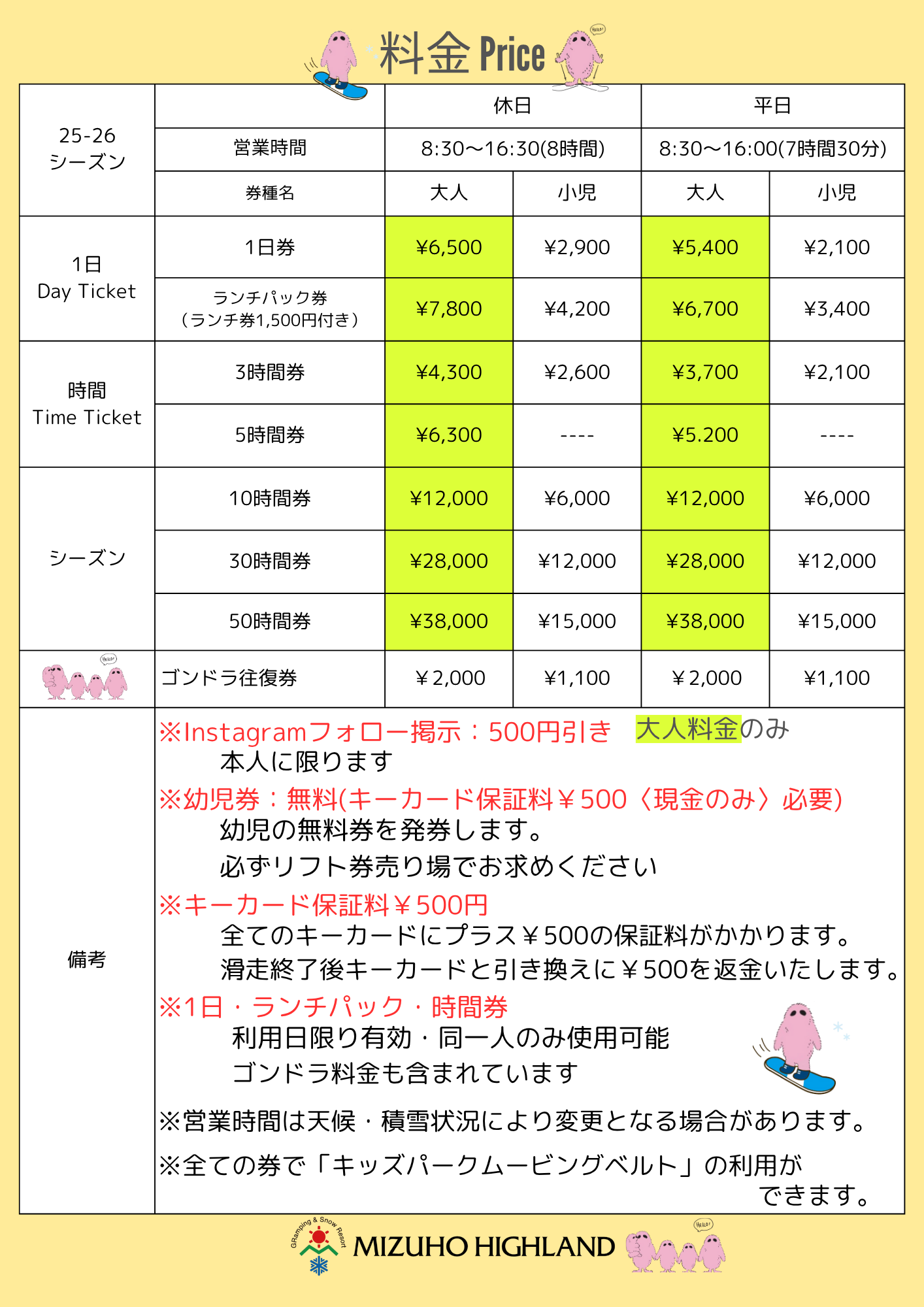 リフト券の新しい料金です。スキー・スノーボードの計画にぜひご活用ください。