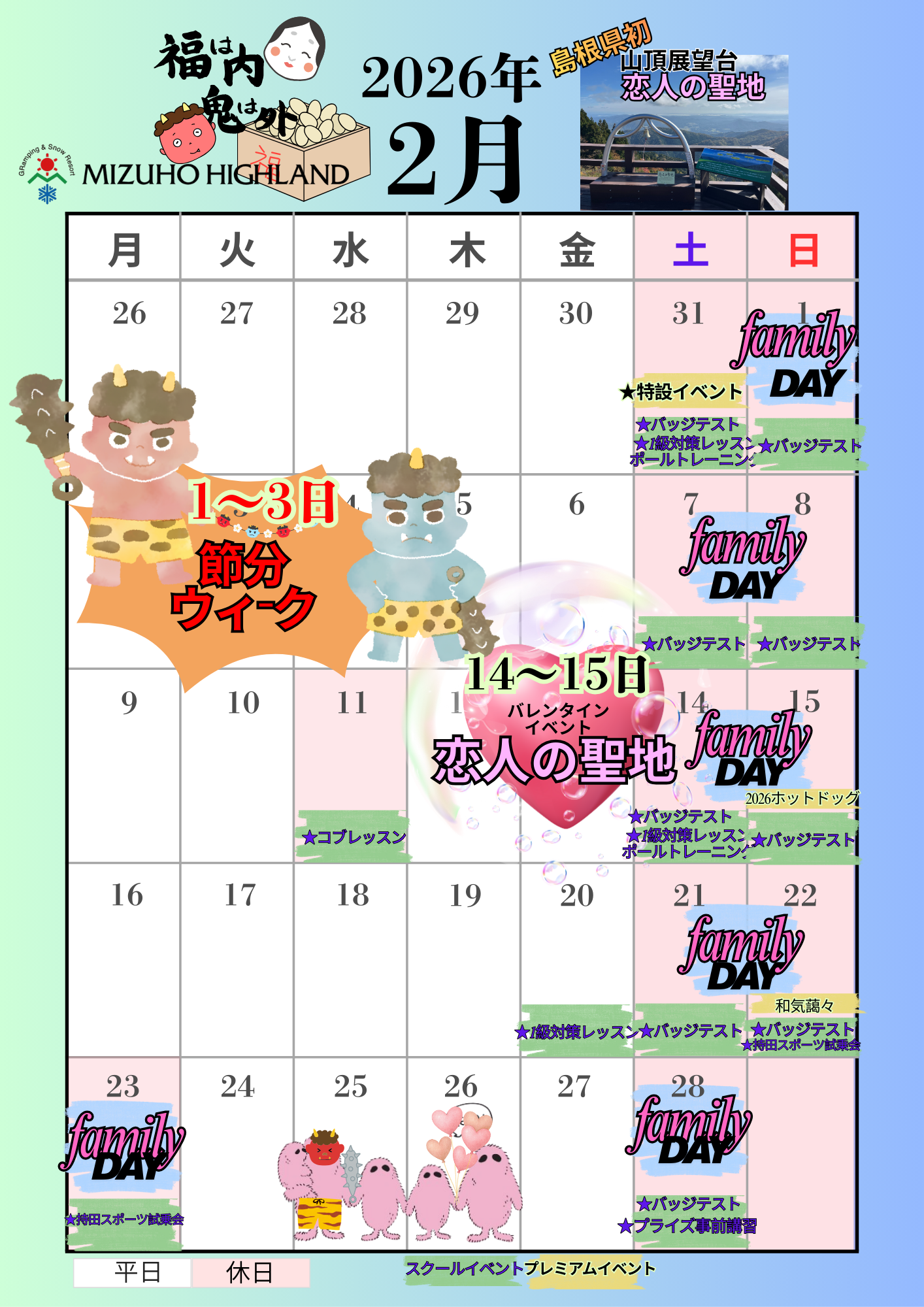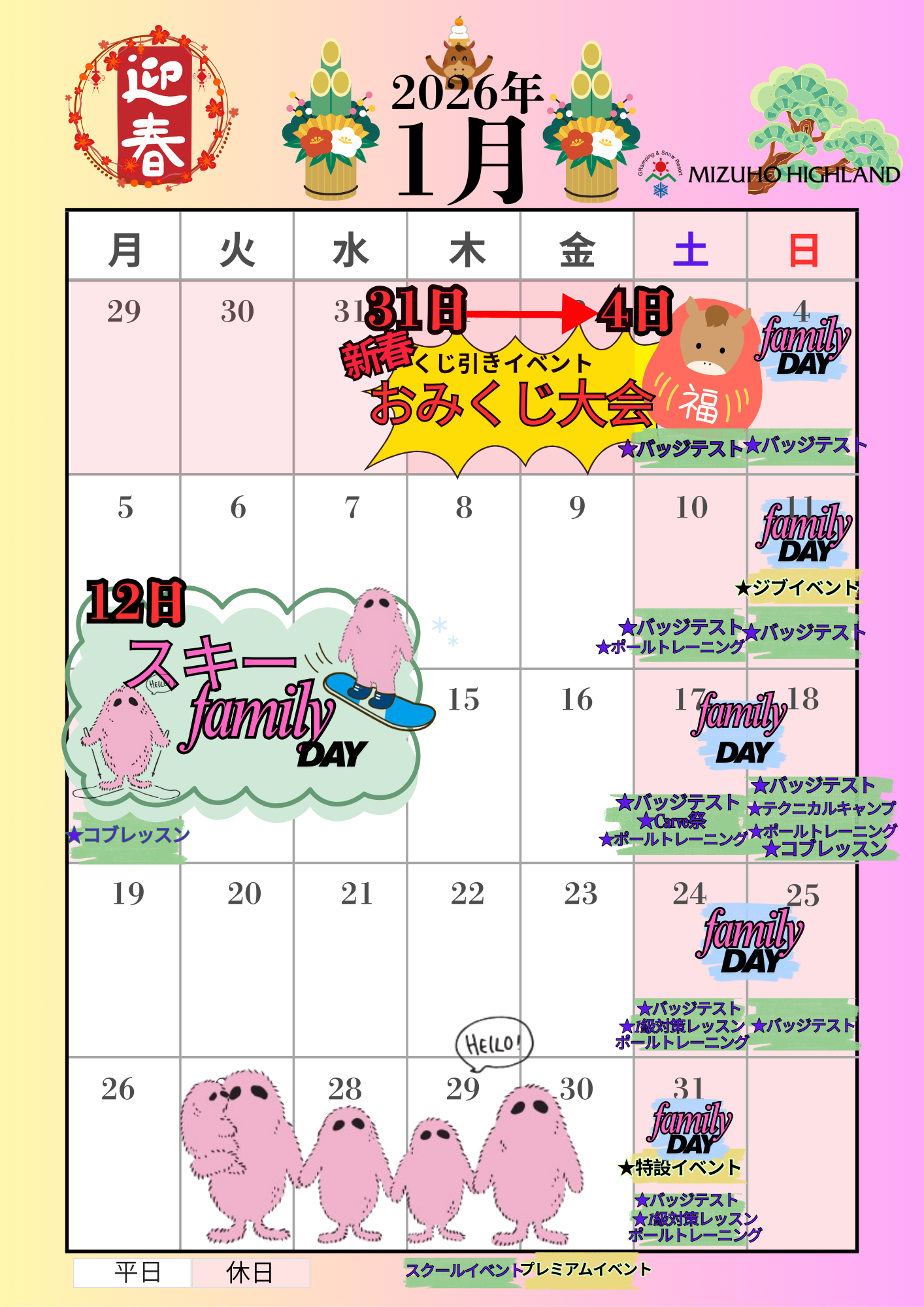 瑞穂ハイランドでは、冬シーズンを通してご家族・ご友人・カップルで楽しめるイベントを多数開催します。スキー・スノーボードはもちろん、週末や祝日限定イベント、季節ならではの催しなど、何度来ても楽しめる内容をご用意しています。