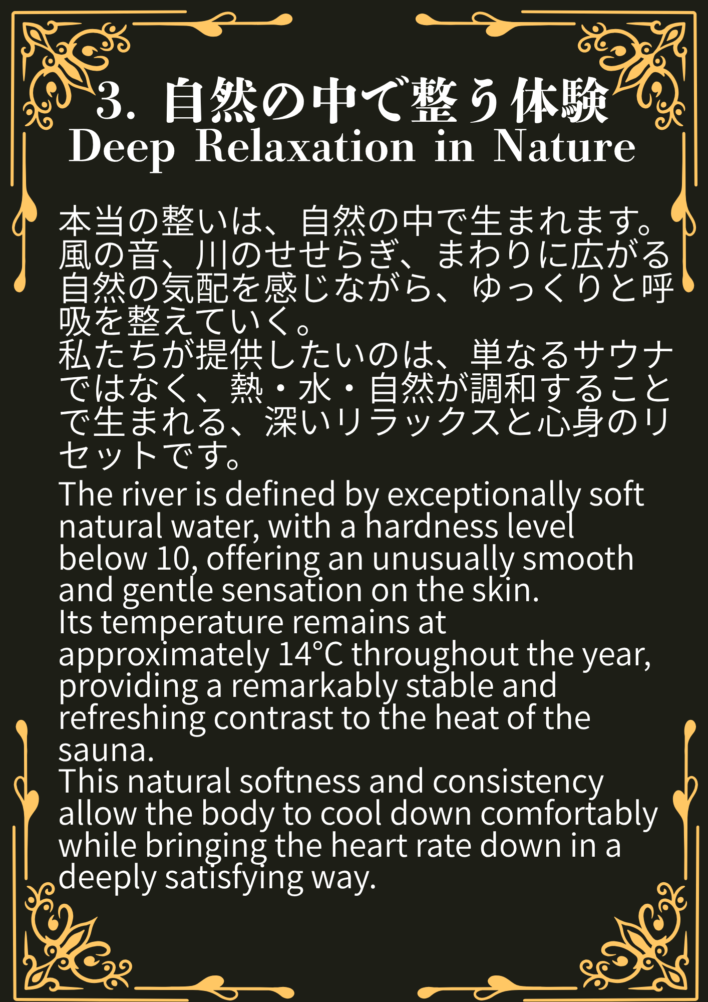 サウナで体を温めた後は、そばにある川に入って整うことができます。川の柔らかい水を堪能しながらサウナをお楽しみください。