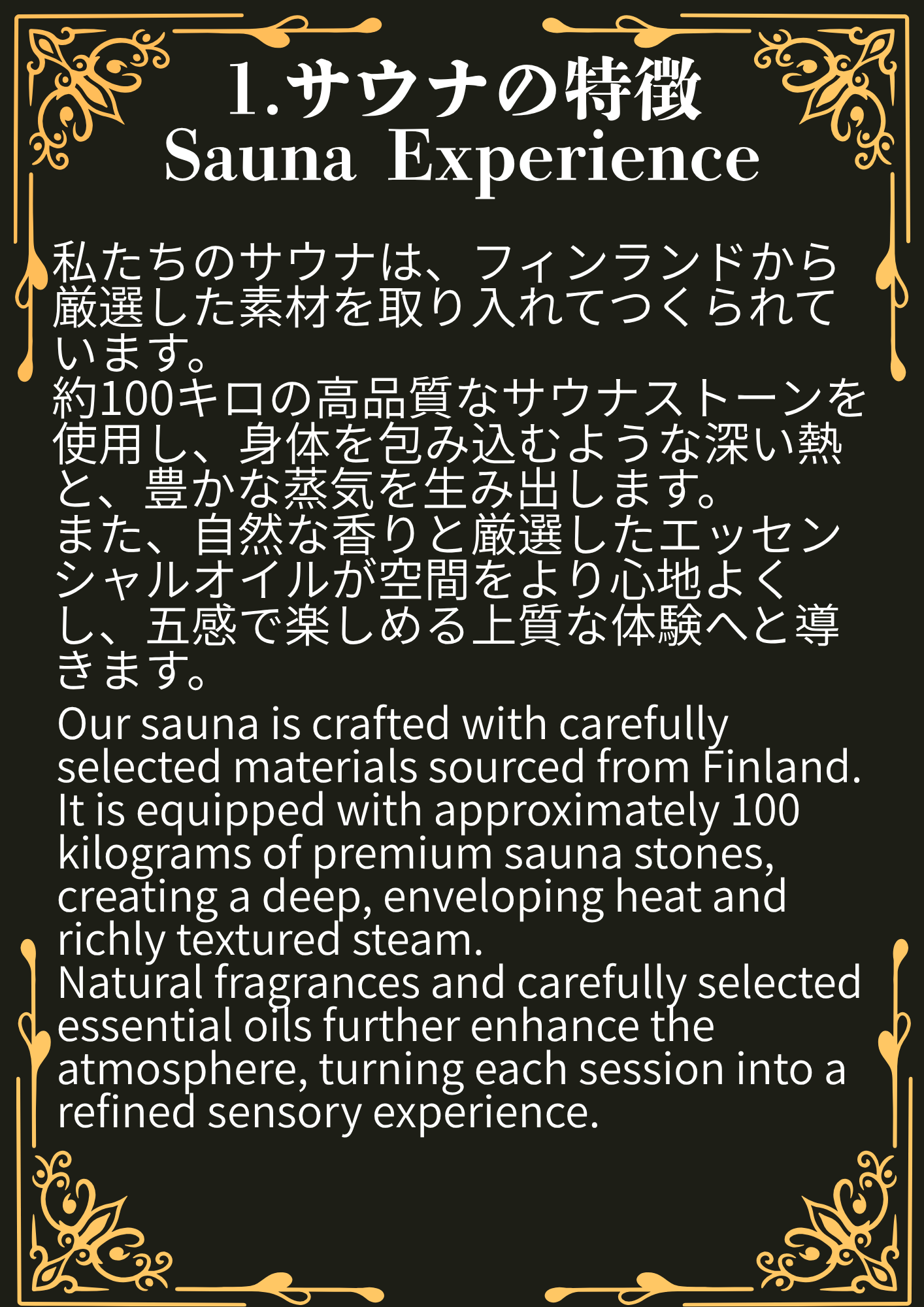 自然の森の中に設営した、大自然の中のプライベートな空間で心と身体を整えることができるフィンランド式サウナです。アロマ水を使ったロウリュも行うことができ、アロマオイルはフィンランドのサウナブランド「rento」のサウナ(ロウリュ)専用のものをご準備しています。その日の気分やお好みで、好きなアロマオイルをお選びいただけます。アロマ水を使ったロウリュの音や、アロマオイルの香り、外気浴での風、そして大自然の景色を全身で感じて見てください。