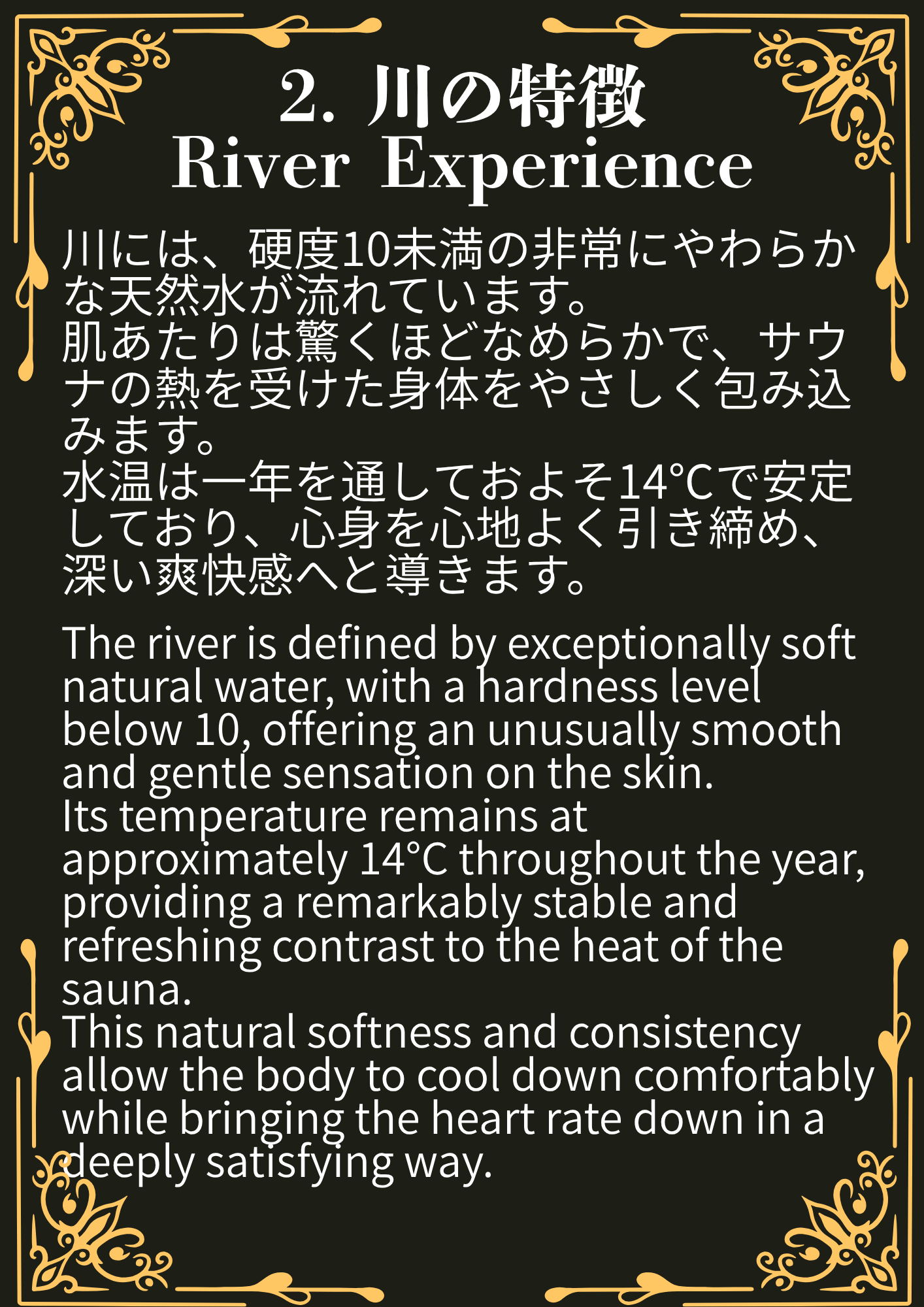サウナで体を温めた後は、そばにある川に入って整うことができます。川の柔らかい水を堪能しながらサウナをお楽しみください。